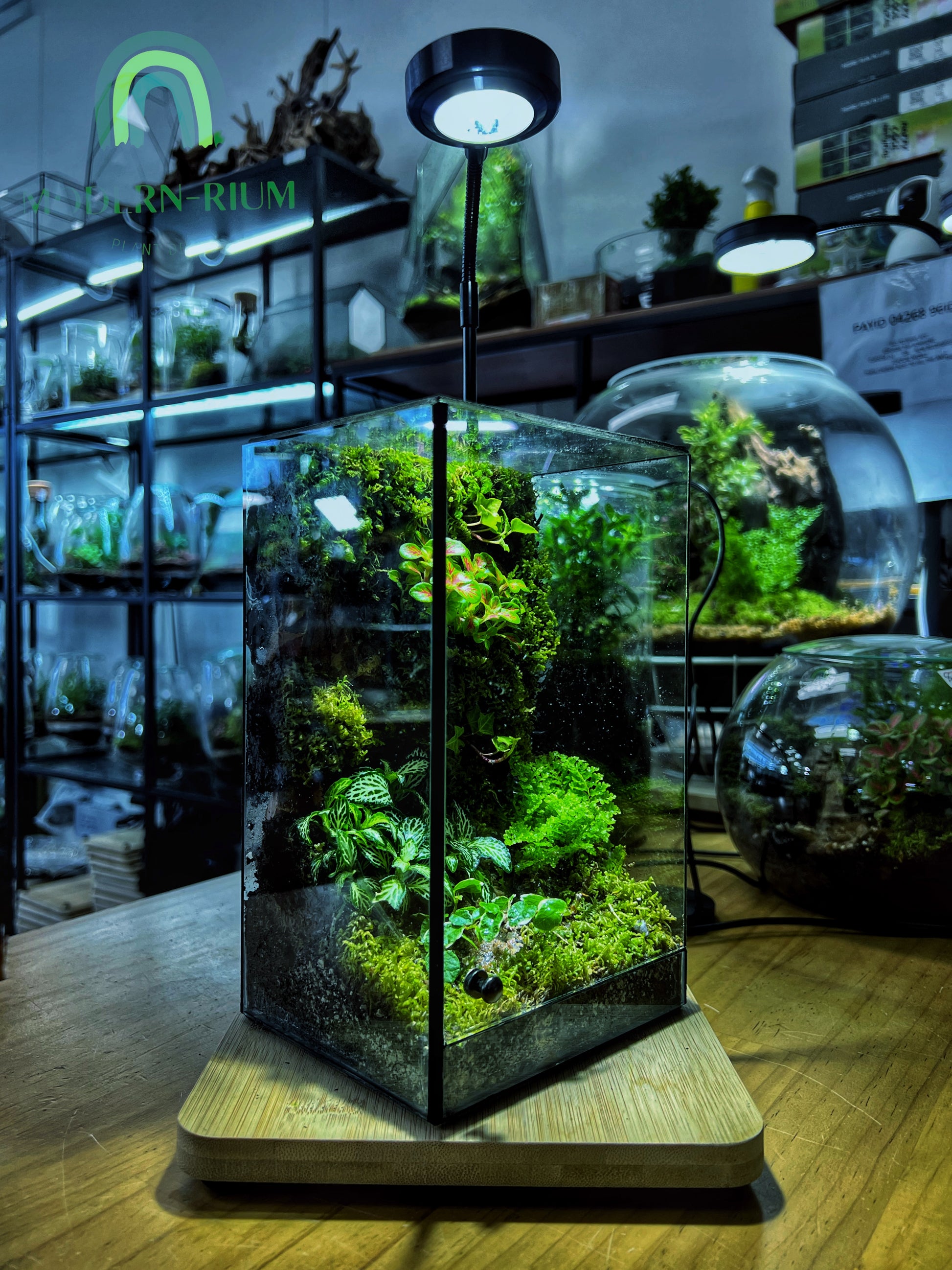 All of our terrariums are carefully designed self-contained ecosystems supported by beneficial bacteria, requiring minimal care and maintenance. Optional terrarium lighting is available for purchase. A discount applies when lights are purchased together with a terrarium as a combo.