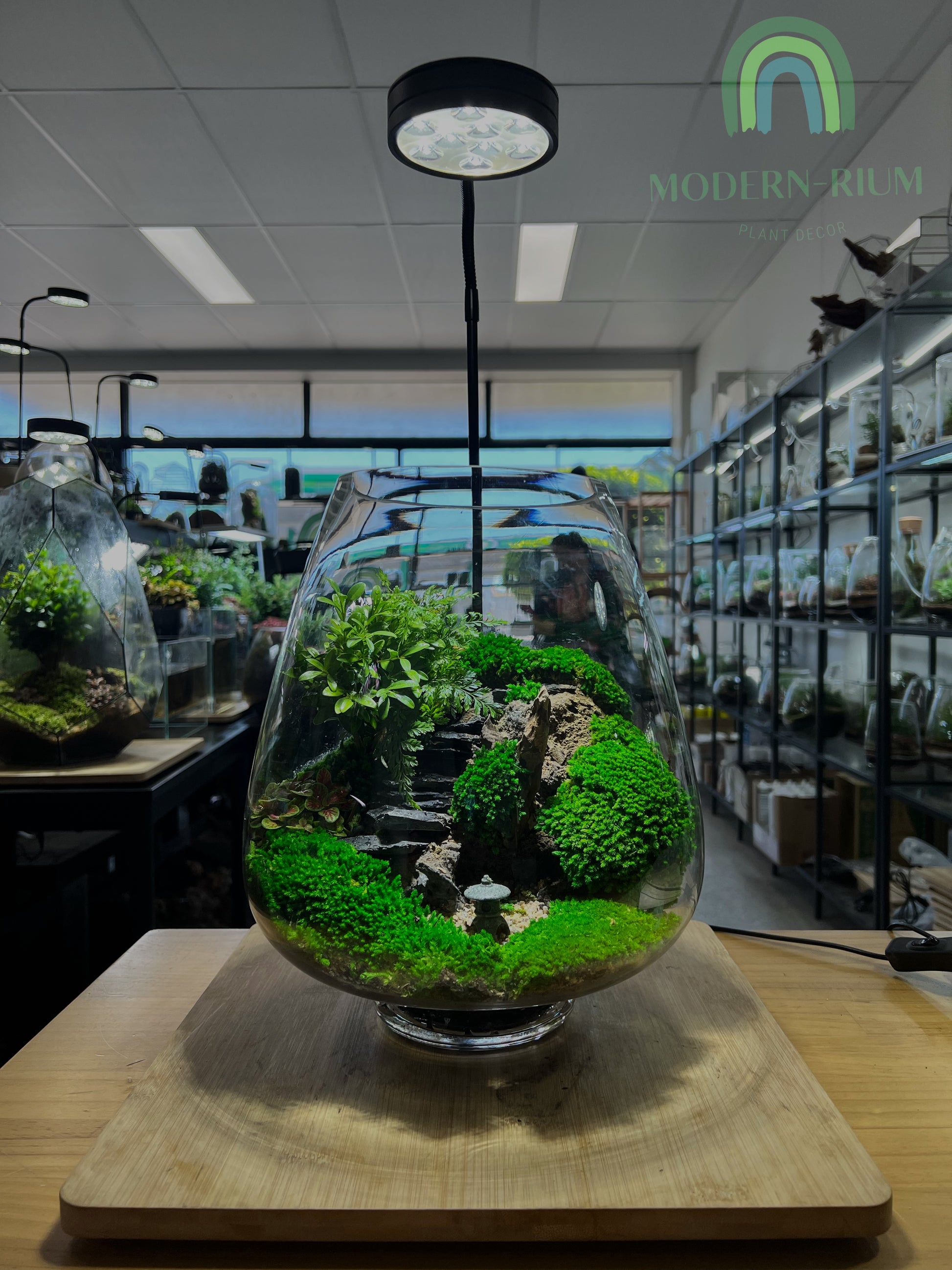 All of our terrariums are carefully designed self-contained ecosystems supported by beneficial bacteria, requiring minimal care and maintenance. Optional terrarium lighting is available for purchase. A discount applies when lights are purchased together with a terrarium as a combo.