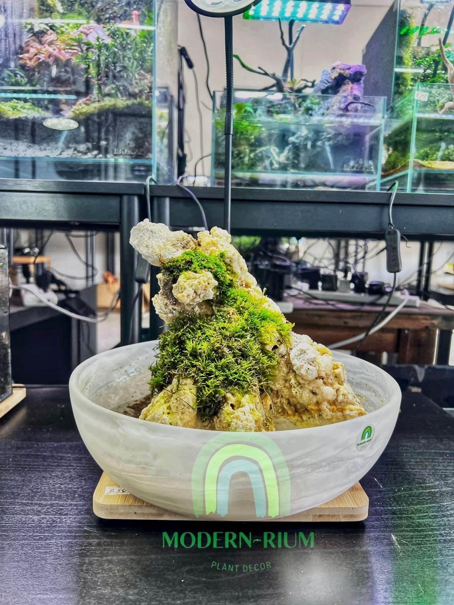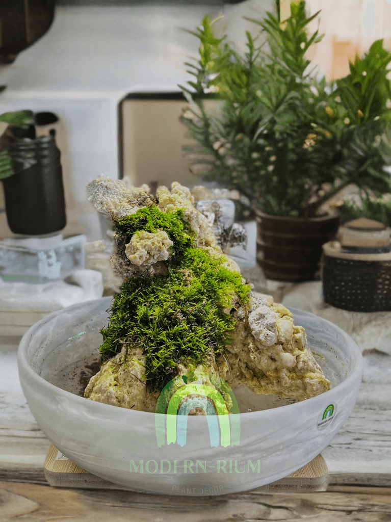 Mistspire captures the quiet majesty of a misty mountain peak emerging from the clouds. Crafted with natural stone and blanketed in vibrant moss, this terrarium mimics the serenity of high-altitude landscapes. Set within a sleek marble-effect bowl, it fuses raw earth energy with minimalist elegance.