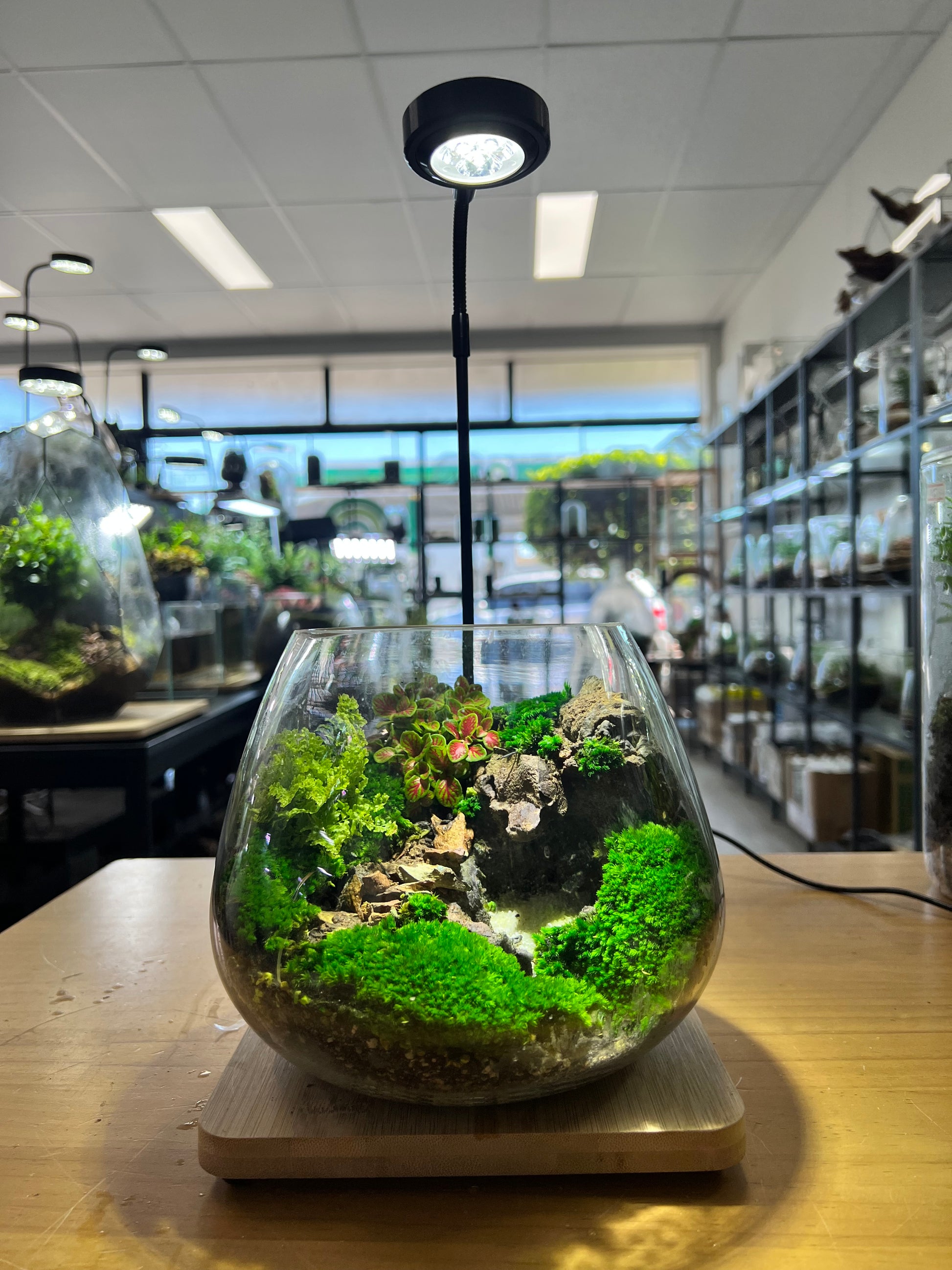 All of our terrariums are carefully designed self-contained ecosystems supported by beneficial bacteria, requiring minimal care and maintenance. Optional terrarium lighting is available for purchase. A discount applies when lights are purchased together with a terrarium as a combo.